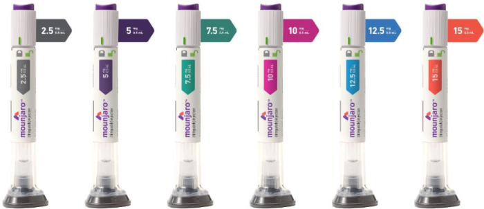 마운자로는 총 6가지 용량으로 제공됩니다: 2.5mg, 5mg, 7.5mg, 10mg, 12.5mg, 15mg. 치료 초기에는 주 1회 2.5mg으로 시작하여 내약성에 따라 4주 간격으로 단계적으로 증량하며, 최대 15mg까지 사용할 수 있습니다.